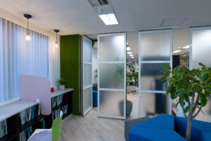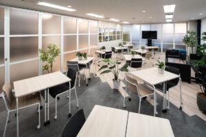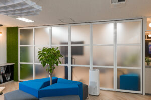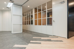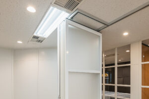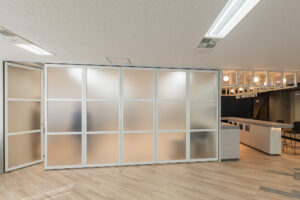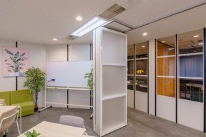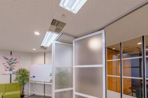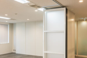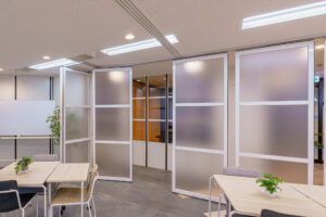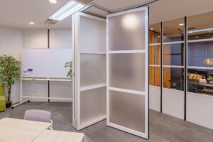 1つの空間を2つに区切ったり、使い方次第でお部屋の使い方に様々なバリエーションが生まれる可動式間仕切壁。ミーティングや応接スペースとして、研修やセミナー会場として、用途に応じて手軽に開閉ができます。可変性のある、レイアウト自由度の高いオフィス創りを叶えます。