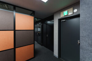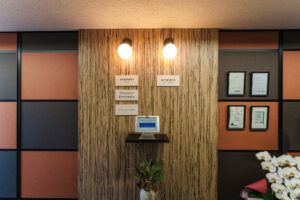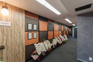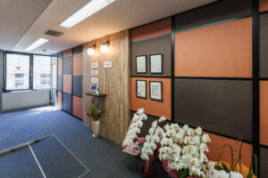 こちらのオフィスでは、テラコッタカラーやダークブラウンのパネルを幾何学的に配置し、美しい木目調の壁面と調和させることで、温かみと高級感を併せ持つ独自の企業アイデンティティを表現しています。