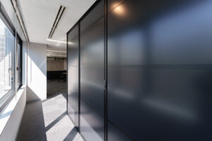 透明なガラスを使用しつつも、ブラックフレームの直線的なラインが存在感を示し、空間をスタイリッシュに区切っています。視線は通しつつも、執務室内のセキュリティや音のプライバシーはしっかりと確保されており、さらに奥には集中して会議を行えるクローズドな会議室も併設しています。