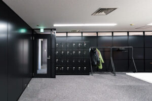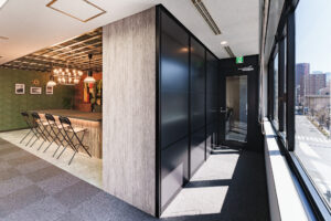 クライアント様の高いデザイン志向を反映し、スタイリッシュなブラックパーティションをベースに構築された、意匠性と機能性を兼ね備えたモダンなオフィス空間の施工事例。