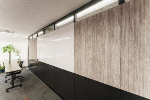 パーティションパネルに3M社のダイノックシートや、サンゲツ社のリアテックシートなど、意匠性の高い化粧シートを施工しました。