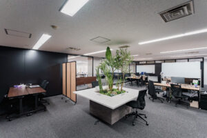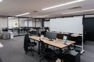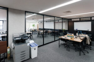 セミナールームから続く執務室は、全面ガラスパーティションで間仕切りを行いました。 ガラスパーティションの最大のメリットは、空間に「抜け感」をもたらし、オフィス全体を広く明るく見せることです。自然光をオフィス奥まで取り込むことで、省エネ効果や社員のウェルビーイング向上も期待できます。
