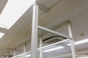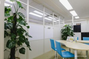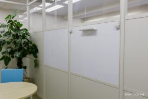 ホワイトボードのパネルも取り入れ、シンプルコンパクトながら機能的で、風通しの良さが想像できるオフィスデザインに仕上がりました。「ホワイトボードパネルを組み合わせたアルミパーティションは、間仕切りとしてだけでなく会議/商談用に、ホワイトボードとして使用できる一石二鳥のパーテーションです。」