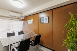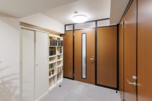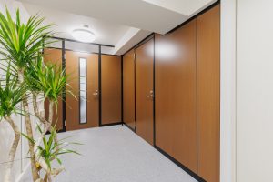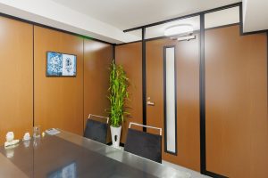 遮音性に優れたスチールパーティション。エントランス側のお客様の目が触れる表は木目パネルで温かみのある印象に。裏側の執務室はモノトーンバイカラーのミニマムデザインと、スチールパーティションの構造を生かして表裏で異なるデザインが特徴的です。ワンフロアに個室の応接室・執務スペース・書庫スペースなど複数の機能を持たせたレイアウトもポイントです。