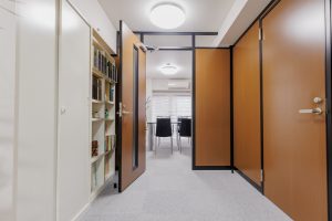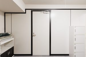 施工種 | ドア付スチールパーテーション(ブラッキー・ホワイト)+ウォールナットパネル |