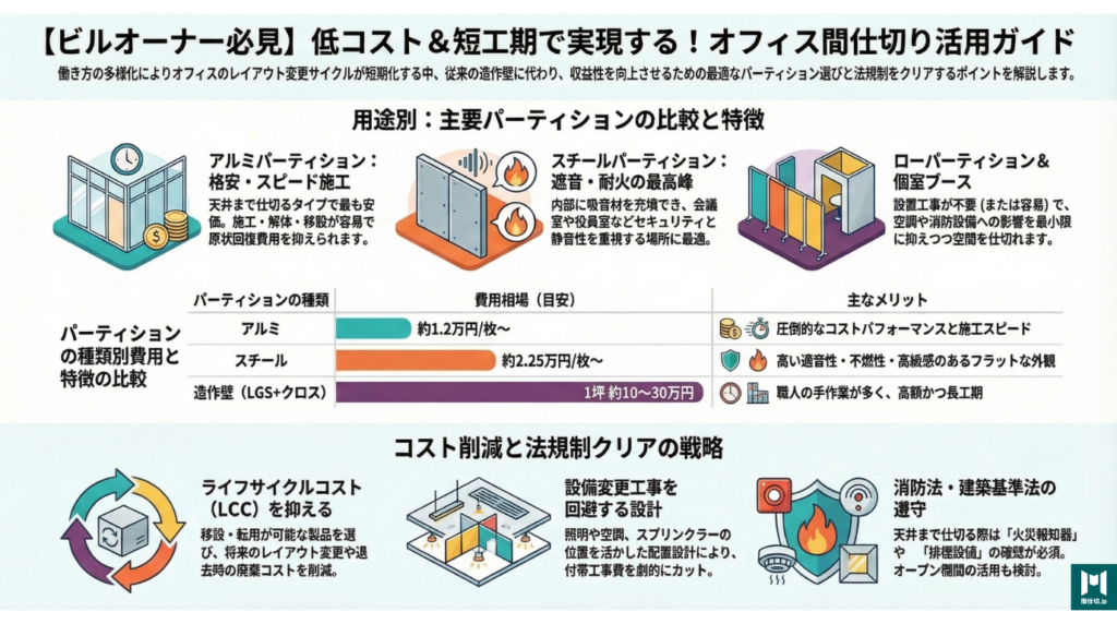 | アルミパーティション | 約1.2万円/枚〜 | 最も安価。初期費用を抑えたい場合に最適。 |