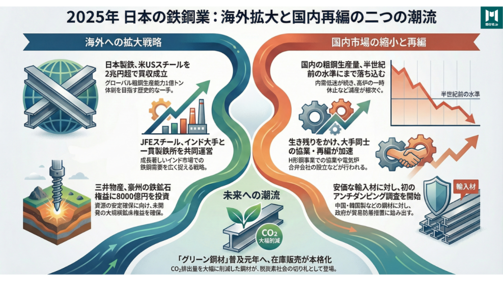 2025年の鉄鋼業界は、「海外への積極拡大」と「国内の深刻な縮小・再編」という二つの大きな潮流が交錯する、まさに激動の一年でした。それに加え、政府による「新たな貿易戦略」への転換、そして未来への希望である「グリーン化への挑戦」が始まっています。