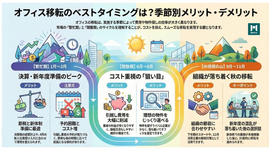 - 1. 季節で考える「オフィス移転の繁忙期と閑散期」:コストと物件数のバランス
